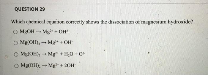 Solved Question 21 Which Chemical Equation Shows The Dissociation Of Magnesium Hydroxide B Mg Oh 2 Mg2 20h Mgoh Mg2 Oh Mg Oh 3 Mg3 301 Mg Oh 2 M Mg2 Hzo 02