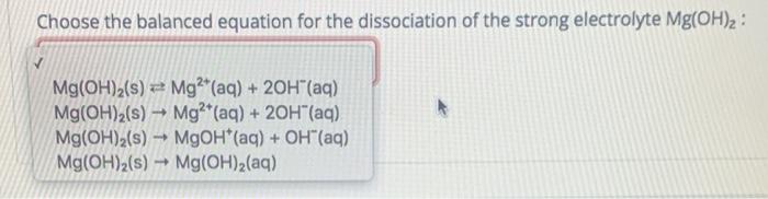 The balanced equation will appear above. Mg OH2 Mg2 2017 MgOH Mg2 OH2 Mg OH3 Mg2 30H Mg OH2 Mg2 H20 02-. Write the chemical equation for the dissociation of acetic acid HC2H3O2 in water donâ t forget equilibrium arrows.